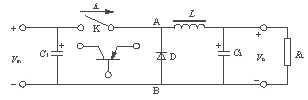 开关稳压电源电路如图2所示。图2中的开关K以一定的时间间隔重复地接通和断开,在K接通时,输入电源Vin通过K和滤波电路供电给负载RL,当K断开时,输入电源Vin便中断了能量的提供。可见,输入电源向负载提供能量是断续的,为使负载能得到连续的能量提供,开关稳压电源必须要有一套储能装置,在开关接通时将一部份能量储存起来,在开关断开时,向负载释放。图2中,由储能电感L、滤波电容C2和续流二极管D组成的电路,就具有这种功能。在AB间的电压平均值VAB可用式(1)表示。